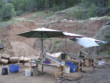 Our workstation for the week. All pile owners received the same tools to work their piles: A shovel, a sieve/classifier screen, a sluice box, a pan, a cup, buckets, and most important during the 100F heat wave - an umbrella for shade.